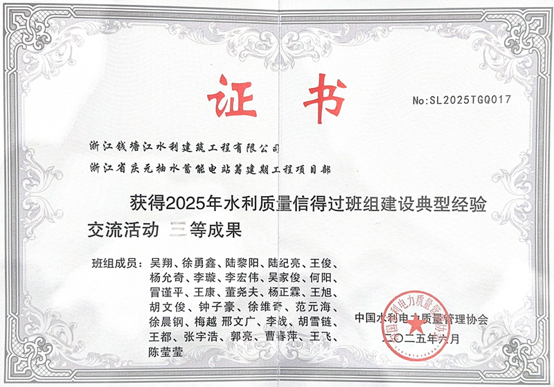 近日,中國水利電力質(zhì)量管理協(xié)會(huì)公布2025年度水利質(zhì)量信得過班組建設(shè)典型經(jīng)驗(yàn)交流活動(dòng)評選結(jié)果,慶元抽蓄籌建期EPC總承包項(xiàng)目憑借扎實(shí)有效的質(zhì)量管理實(shí)踐和突出的建設(shè)成果,榮獲“2025年水利質(zhì)量信得過班組建設(shè)典型經(jīng)驗(yàn)交流活動(dòng)”三等成果。這一榮譽(yù)不僅為“浙錢水建”品牌再添光彩,更標(biāo)志著公司在工程質(zhì)量管理領(lǐng)域獲得了行業(yè)權(quán)威機(jī)構(gòu)的高度認(rèn)可。