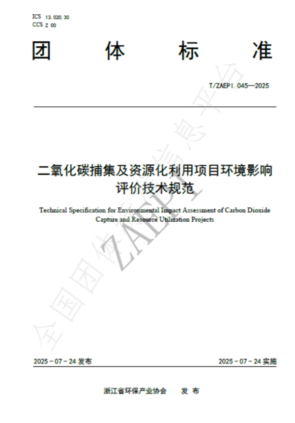 2025年7月24日,由浙江省環(huán)保集團(tuán)生態(tài)環(huán)保研究院牽頭制定的《二氧化碳捕集及資源化利用項(xiàng)目環(huán)境影響評價(jià)技術(shù)規(guī)范》(T/ZAEPI 045-2025)團(tuán)體標(biāo)準(zhǔn)正式發(fā)布并實(shí)施。該標(biāo)準(zhǔn)由浙江省環(huán)保產(chǎn)業(yè)協(xié)會(huì)歸口管理,聯(lián)合省內(nèi)多家環(huán)保領(lǐng)域骨干企業(yè)共同起草,填補(bǔ)了工業(yè)領(lǐng)域二氧化碳捕集及資源化利用項(xiàng)目環(huán)評技術(shù)規(guī)范的空白。